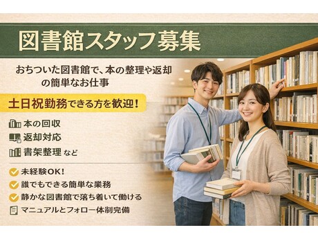・図書館勤務で落ち着いた環境・未経験から始めやすいシンプルな業務内容・土日祝に入れる方・体を軽く動かしながら働ける・利用者対応は最小限、丁寧な対応ができればOK・マニュアル・指示体制が整っていて安心